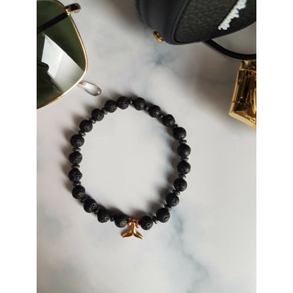 Mooie armband van 6mm lavakralen en hematietdiscs. In het midden een goudkleurige walvisstaart van dq (designer quality)r metaal als detail.