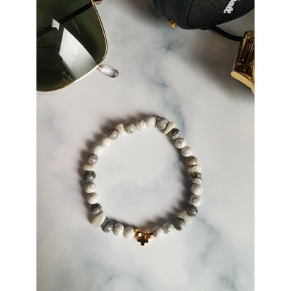 Kralenarmband voor heren op elastiek. De 6mm grijze en wit-marble natuursteenkralen wisselen elkaar af en ertussen zijn er witte natuursteenchips. In het midden vind je goudkleurige kralen en een plusteken.